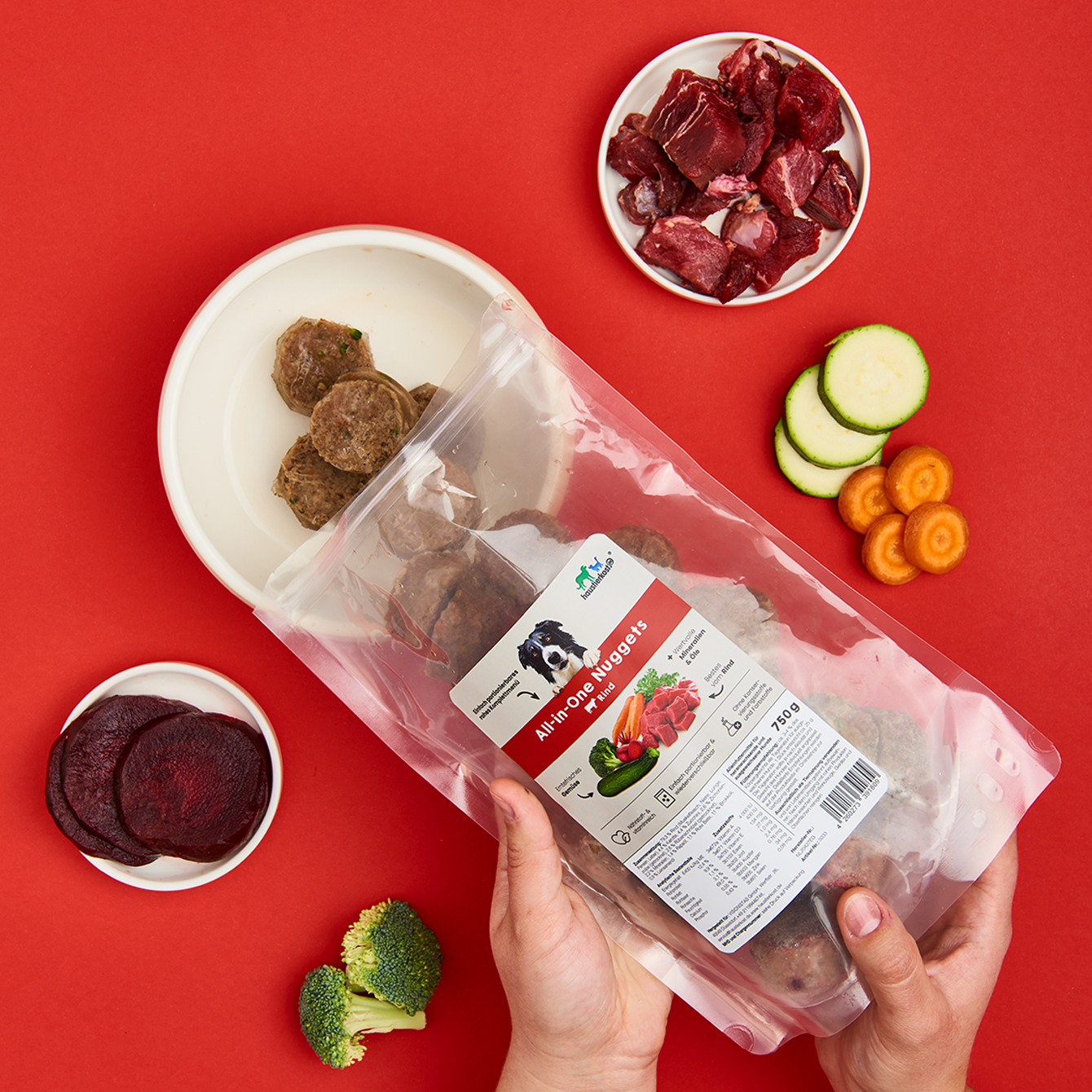 Our all-in-one chicken nuggets are a complete meal that contains all the nutrients your four-legged friend needs, so you don't have to add anything. This ensures that your dog gets all the vitamins, minerals and proteins it needs to stay healthy and vital. This product is therefore perfect for BARF beginners, as this type of raw feeding does not require any prior knowledge, research or independent menu planning.