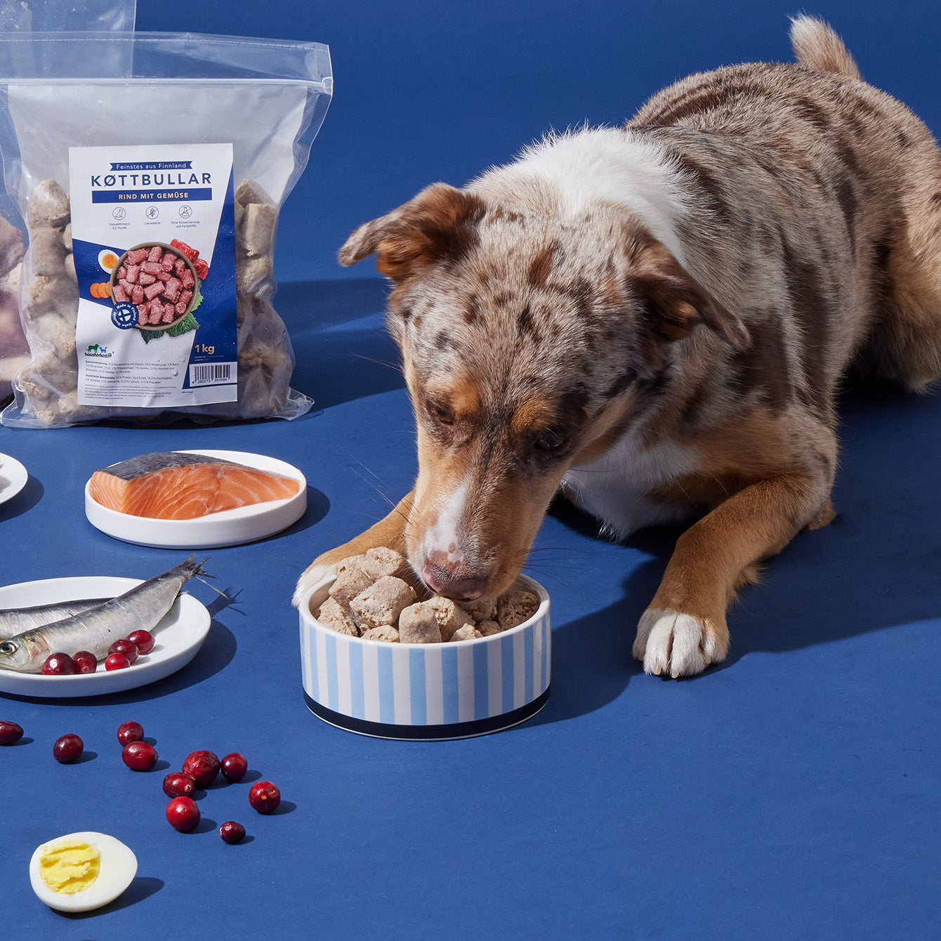 The basis of our meatballs is beef tripe, meaty chicken loin and salmon. Supplemented with chicken liver, fresh vegetables and egg, this results in a tasty and wholesome ration for your dog. To ensure the supply of nutrients, we also add seaweed, linseed oil and some vitamins and minerals. The individually frozen balls make this complete meal easy to portion. Simply take out the amount you need and only let it thaw. The rest can be immediately put back in the freezer in a resealable bag. Even after a larger amount has thawed in the refrigerator, the meatballs can still be portioned individually.