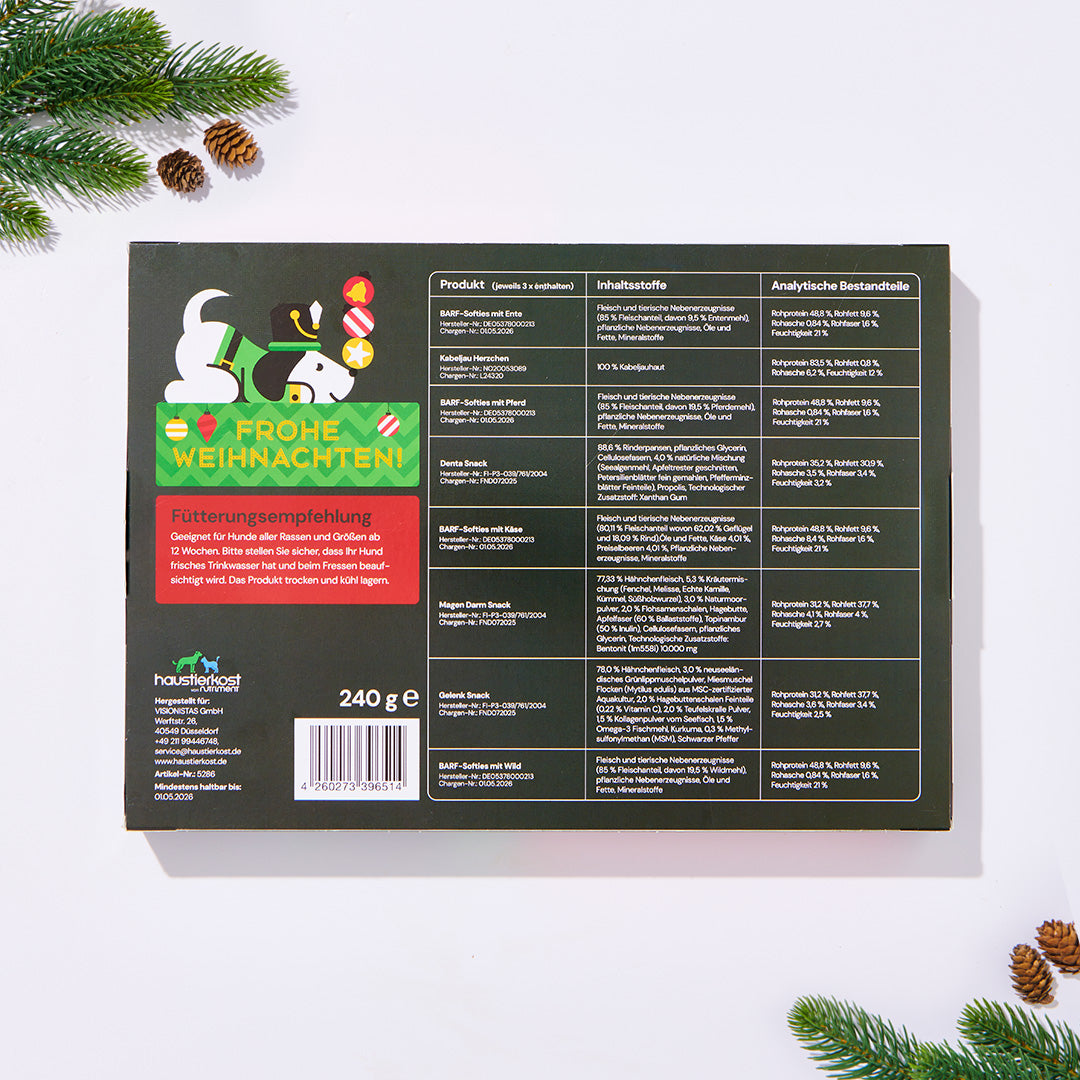 Erlebe die Weihnachtszeit gemeinsam mit Deinem Hund und mache das Fest auch für Deinen Vierbeiner zu etwas ganz Besonderem. Mit unserem liebevoll zusammengestellten Adventskalender bringst Du Freude für vier Pfoten in die Vorweihnachtszeit. Hinter 24 Türchen warten abwechslungsreiche und leckere Snacks. So wird jeder Dezembertag auch für Deinen treuen Begleiter zu einem kleinen Festmoment.