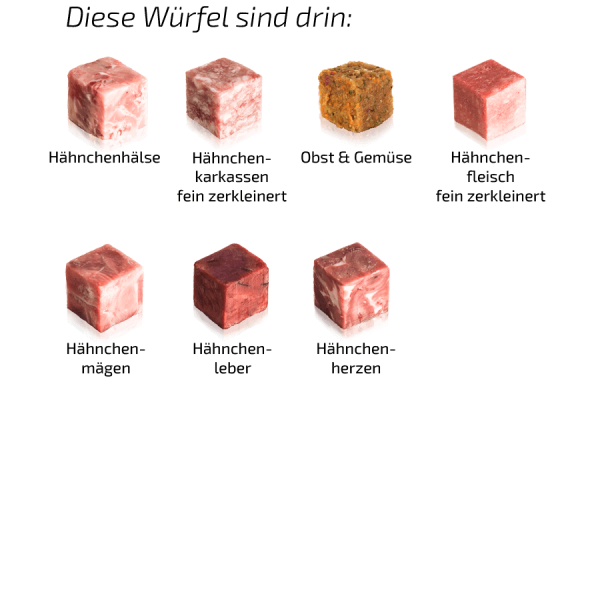 Mit 7 verschiedenen Graf Barf Rohfutterwürfeln (2,5 cm Kantenlänge) ist ein abwechslungsreiches, artgerechtes, ausgewogenes und gesundes Menü für Deinen Hund garantiert. Die Zutaten stammen ausschließlich vom Hähnchen und sind naturbelassen sowie in Lebensmittelqualität.