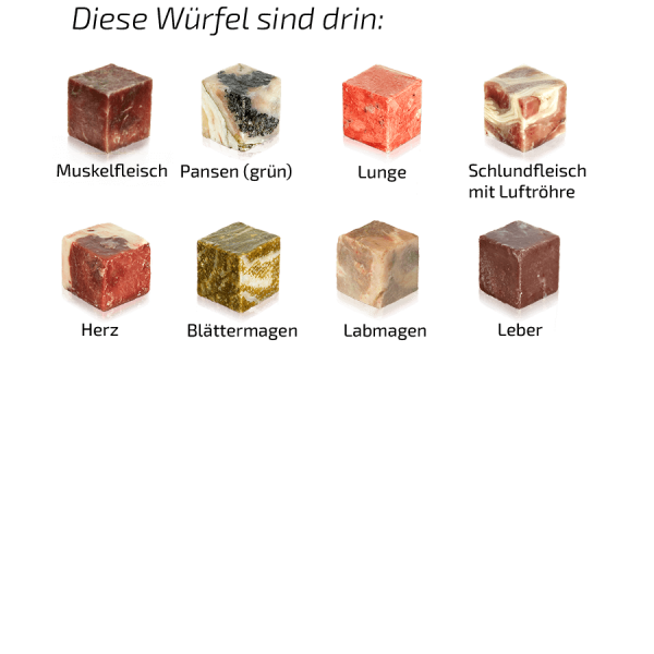 Muskelfleisch 46,5%; Innereien 25,2%; Pansen, Blättermagen, Labmagen 28,3%