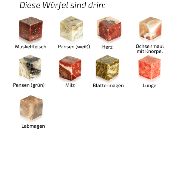 Muskelfleisch 52%; Innereien 18%; Pansen, Blättermagen, Labmagen 30%