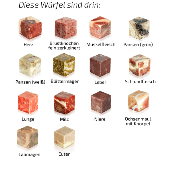 Muskelfleisch 41,3%; Innereien 18,8%; Knochen 13,5%; Pansen, Blättermagen, Labmagen 13,5%