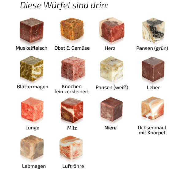 Mit 14 verschiedenen Graf Barf Rohfutterwürfeln (2,5 cm Kantenlänge) ist ein abwechslungsreiches, artgerechtes, ausgewogenes und gesundes Menü für Deinen Hund garantiert. Die Zutaten stammen ausschließlich vom Rind, sind naturbelassen, in Lebensmittelqualität und frei von künstlichen Zusatzstoffen.