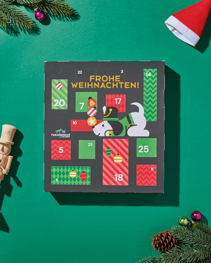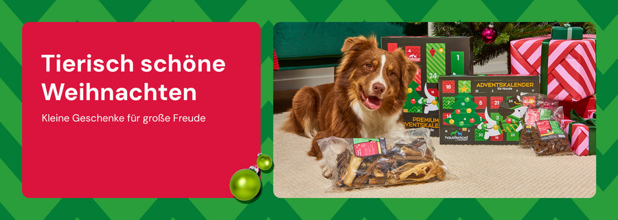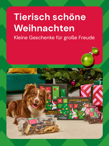 Dieses Jahr warten bei uns festliche Highlights auf Dich und Deinen Hund: Zwei liebevoll gefüllte Adventskalender mit köstlichen Überraschungen, drei weihnachtliche Menüs für den besonderen Festtagsschmaus – dazu viele weitere Leckereien zum kauen und snacken für ein schmackhaftes Weihnachten!